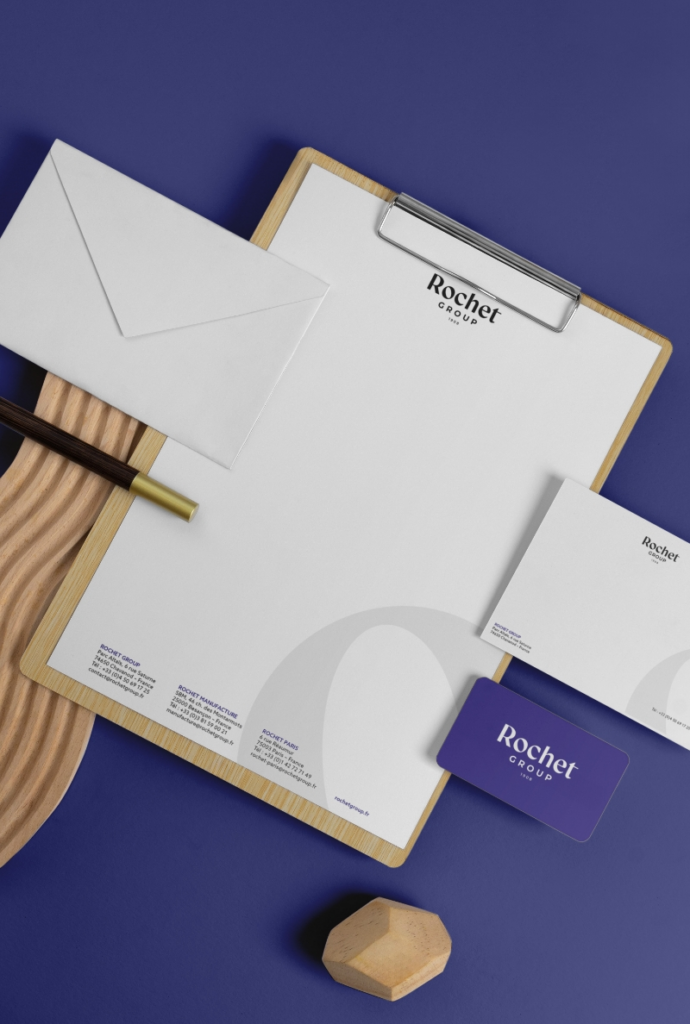 Papeterie institutionnelle : Papier en-tête, enveloppes et blocs-notes logotés pour le Groupe Rochet , implantée à Chavanod (Haute-Savoie) et forte d’un savoir-faire historique dans l’horlogerie et la bijouterie.